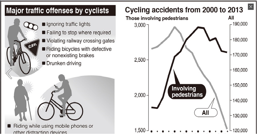 Sampai dengan tahun 2013, di Jepang terdapat sekitar 71.551 juta sepeda dengan jumlah penduduk sekitar 126.66 juta jiwa. Jadi lebih dari 50% penduduk Jepang memiliki dan menggunakan sepeda (semua sepeda di Jepang wajib memiliki nomor register dan surat lengkap). Dari hasil survey terhadap 1.945 responden, sekitar 42% pesepeda rutin menggunakan untuk olahraga, 41% untuk mempercepat perjalanan dan menghemat anggaran dan 9% pengguna beralasan untuk menyelamatkan lingkungan dari polusi. Apa yang melatarbelakangi diterapkannya aturan “baru” tersebut? Ternyata bukan karena meningkatnya angka kecelakaan khususnya sepeda di Jepang tetapi karena semakin meningkatnya rasio kecelakaan fatal yang terjadi. Berdasarkan data, kecelakaan sepeda tahun 2014 sebenarnya turun dari 188.338 kasus pada tahun 2004 menjadi hanya 109.269 kasus, tetapi kecelakaan fatal hanya turun sedikit dari 870 menjadi 542 kasus. Rasio kecelakaan fatal secara keseluruhan meningkat 1.3 persen menjadi 13.5%. kecelakaan fatal termasuk jatuh sendiri di pedestrian meningkat menjadi 82 kasus dari 51 kasus pada tahun 2004. Aturan lalu lintas direvisi karena ternyata kecelakaan fatal banyak terjadi pada pesepeda. Hmm… padahal menurut kita pasti angka yang tidak begitu signifikan perbedaannya.