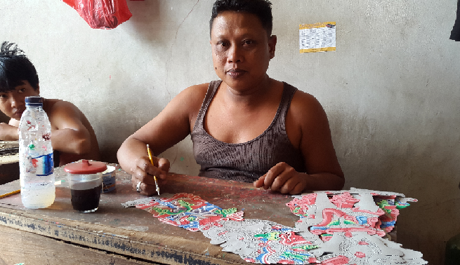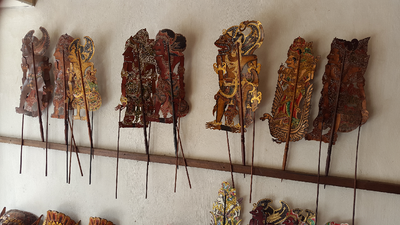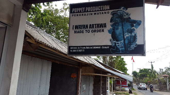 Di Banjar Jeleka sedang ada perbaikan jembatan gantung. Maka saya harus mencari gang kecil lain yang bisa menghubungkan saya menuju Ubud. Tanpa disadari, saya kesasar dan masuk ke dalam Banjar Puaya. Saat terdiam mencari arah jalan, mata saya tertumbuk pada sebuah toko kecil berhiaskan wayang-wayang kulit yang menjadi pokok barang dagangannya. Dan surprise-nya lagi, saya melihat di sebelah toko seperti ada garase kecil yang didalamnya ada para pekerja seni pembuat wayang kulit Bali yang terkenal.Â
