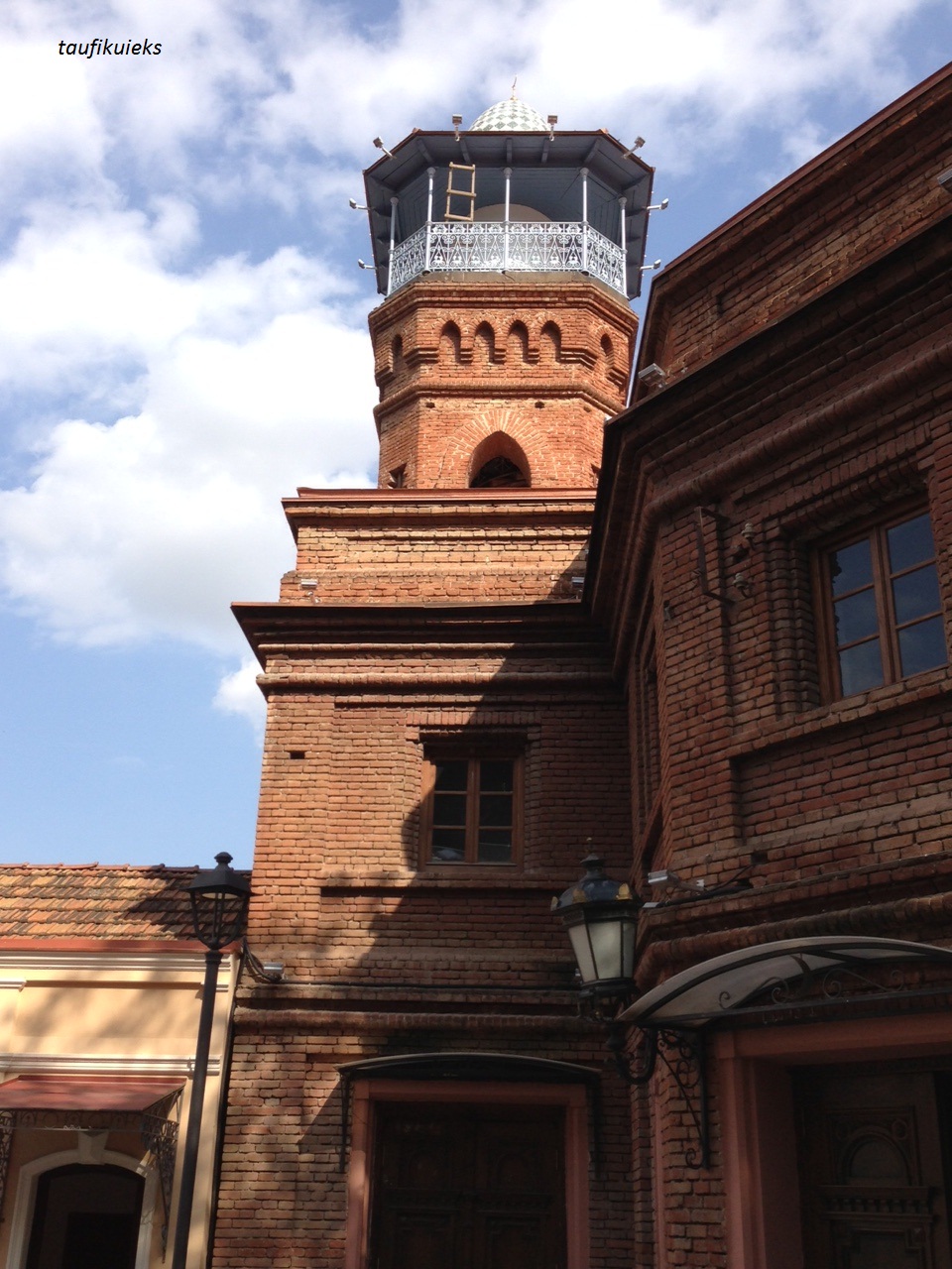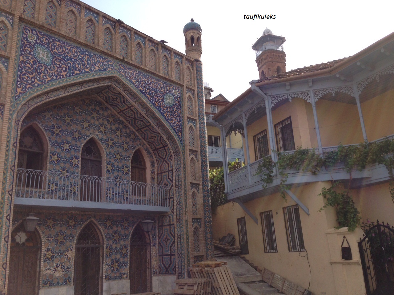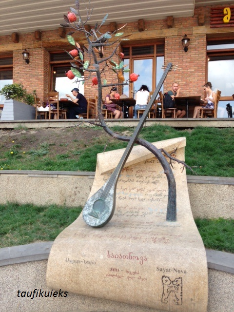 Kembali berjalan menyusuri jalan raya dengan bentangan sungai Kura atau Mtkvari yang membelah kota Tblisi, menajadi latar belakang yang menawan. Di perapatan jalan dimana banyak terdapat cafe dan juga toko suvenir ada taman kecil dengan sebuah tugu berbentuk alat musik mirip gitar yang cantik. Dari tempat ini, menara masjid yang berwarna coklat merah bata kian jelas di atas bukit.