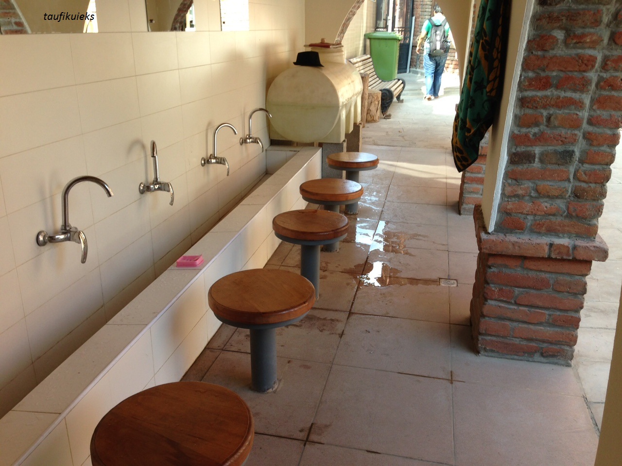 Lebih dari 10 atau 15 menit mendaki, akhirnya kami pun tiba di masjid , masuk ke halaman dalam dan langsung terpesona dengan tatanan tempat wudhu yang rapih dan indah. Keran mungil berbentuk leher angsa dan kursi kecil kayu bundar berwarna coklat dengan tiang-tiang bata merah membuat tempat ini terlihat serasi dan damai.
