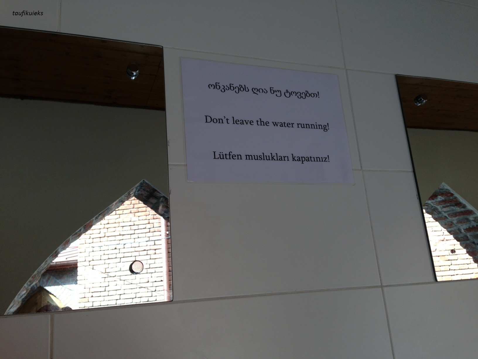 Sementara di dinding tempat wudhu tertempel peringatan untuk menghemat air dalam Bahasa Georgia, Inggris, dan Turki. Sebuah air mancur kecil yang sedang tidak aktif menghiasi bagian tengah halaman dalam masjid ini. Di belakangnya terlihat deretan kamar mandi dengan lorong yang dilengkapi selasar berhiaskan lengkungan-lengkungan yang semuanya tersusun cantik dari bata merah.