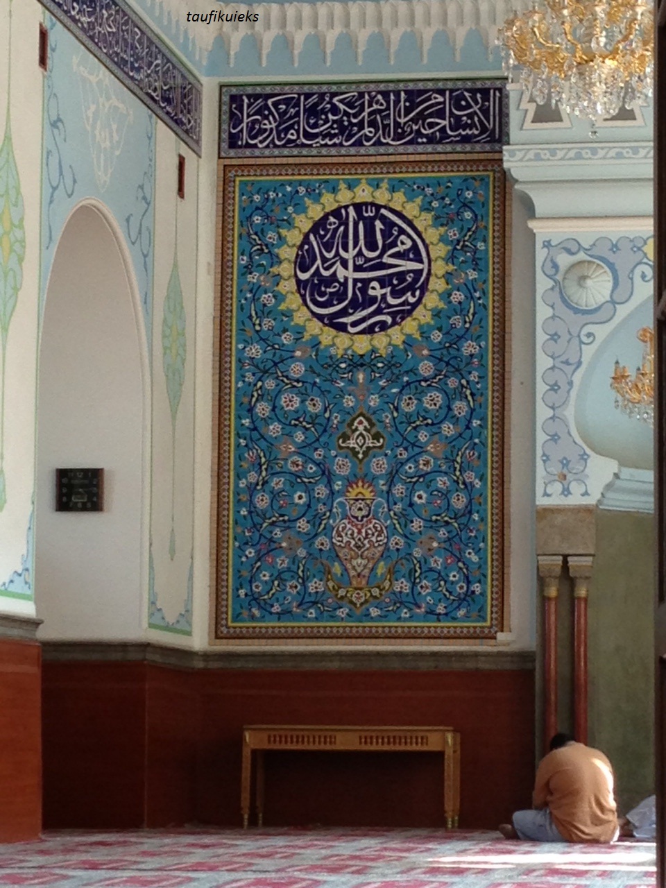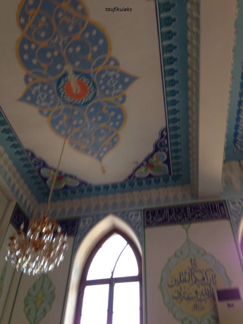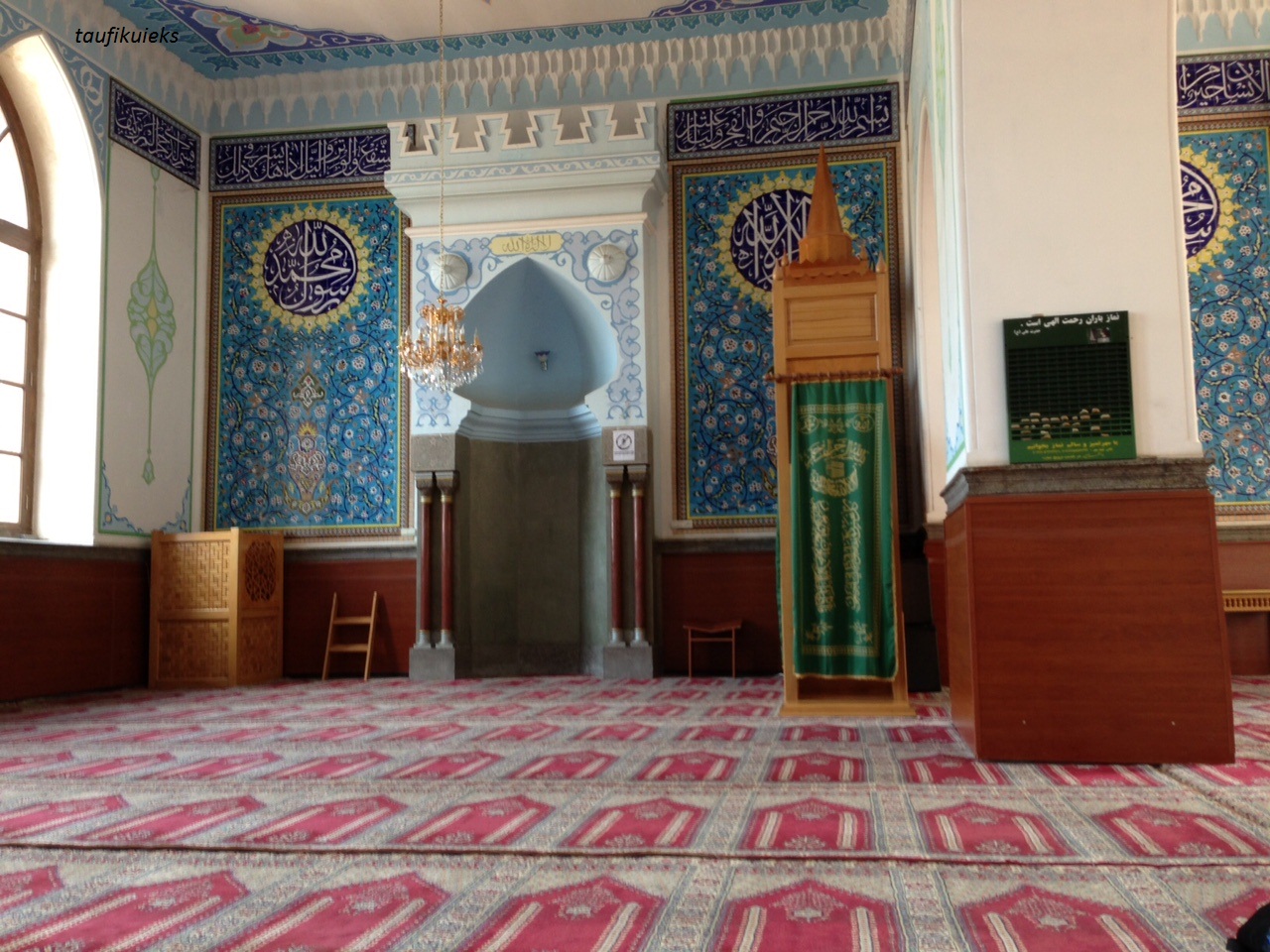 Memasuki ruang utama masjid, saya kembali terpana dengan keindahn interiornya. Hamparan sajadah berwarna merah berjejer rapih di lantai yang tidak terlalu luas. Mimbar dan mihrabnya terbuat dari paduan kayu berwarna coklat dihiasi keramik-Turki yang indah. Tidak kalah dengan indahnya dengan masjid-masjid di Istanbul sana. Beberapa lampu kristal muncul dari langit-langit bagaikn stalaktit di dalam gua yang permai.
