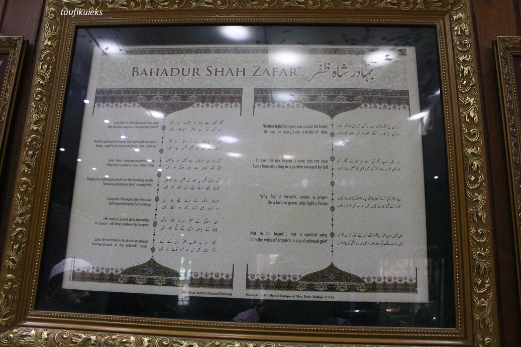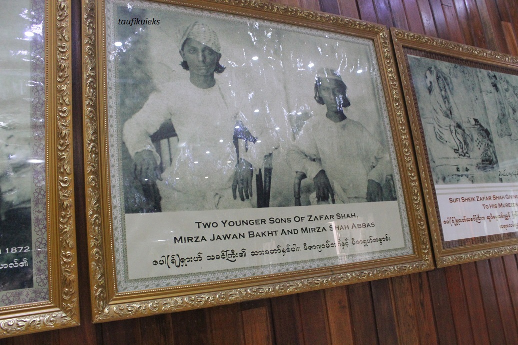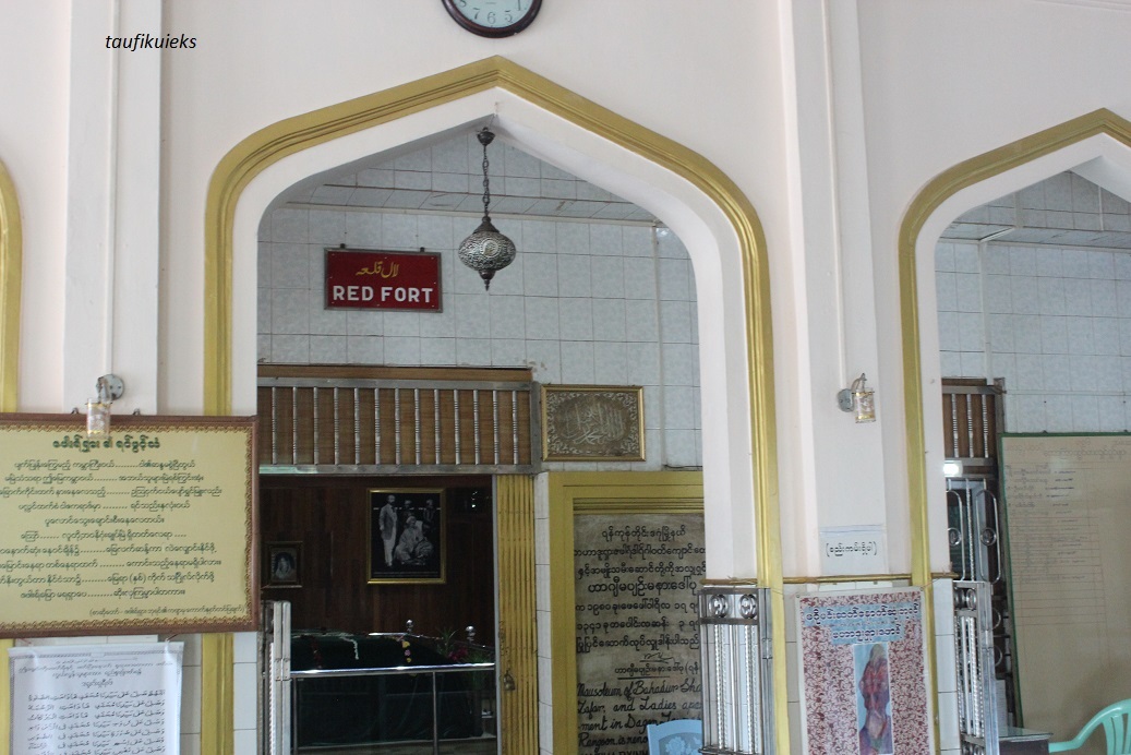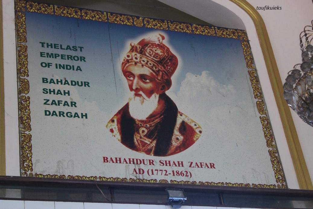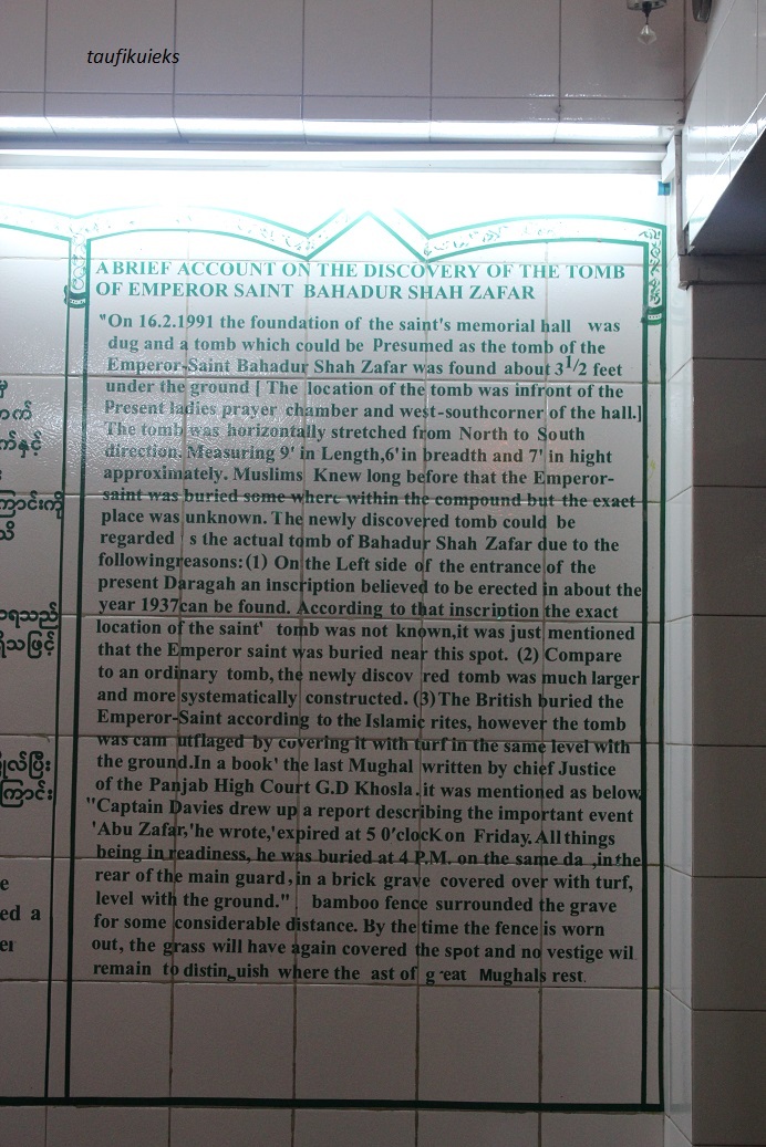 “Dargah Bahadur Shah Zafar, Emperor of India (1837-1857)”, terpatri dengan manis dari besi tempa di atas pintu gerbang masjid dan mausoleum penguasa terakhir Kekaisaran Moghul yang terletak di Jakan Ziwaka no 8 tidak terlalu jauh dari Pagoda Swedagon yang menjadi ikon kota Yangon. Versi asli dalam Bahasa Myanmar juga terselip di antara nama dan jabatan sang “The Last Emperor “ itu,
