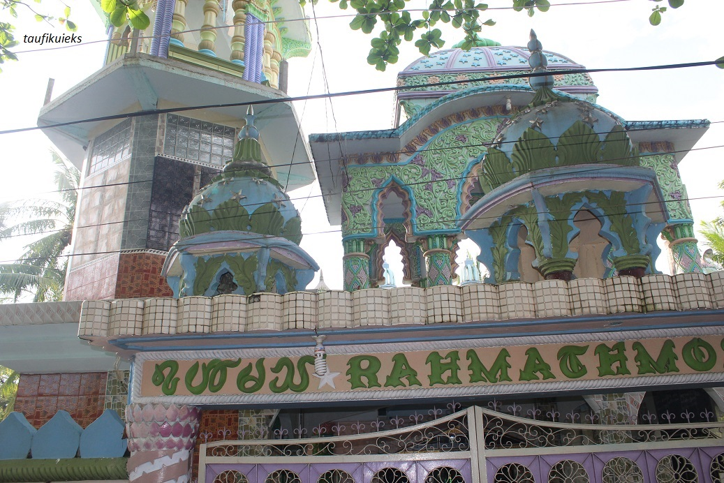 Hiasan berbentuk ukiran dengan motif flora berwarna hijau muda menutupi hampir seluruh bagian kubah dan tiang-tiang kecil penyangganya. Kombinasi warna biru, jingga, hijau, serta coklat muda juga hadir baik di ukiran flora maupun relung-relung di sekitar kubah dan menara. Sementara hamparan bintang-bintang berwarna biru juga bertebaran di puncak kubah utama dan kubah-kubah kecil di sekitarnya. Singkatnya masjid ini walau tidak terlalu besar, hiasan eksteriornya lebih mirip sebuah istana di Dunia Fantasi. Di sini juga terpampang nama masjid ini, yaitu Rahmat Mosque dalam aksara Latin serta juga dalam huruf Hijaiyah.