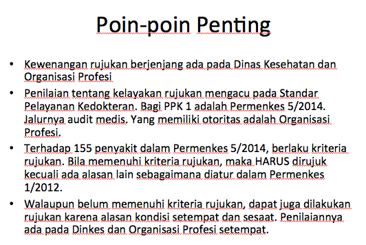 Bagaimana sebenarnya menilai berjalannya Rujukan Berjenjang ini? Seperti dibahas pada tulisan sebelumnya, kembali kita tegakkan bahwa yang memiliki kewenangan pengawasan dan pembinaan Rujukan Berjenjang adalah Dinas Kesehatan dan Organisasi Profesi. Apa instrumennya terkait kompetensi dan kewenangan? Tentu saja Standar Pelayanan Kedokteran. Mari kita dorong keduanya untuk berperan dan memerankan fungsinya secara positif bagi semua pihak.Â