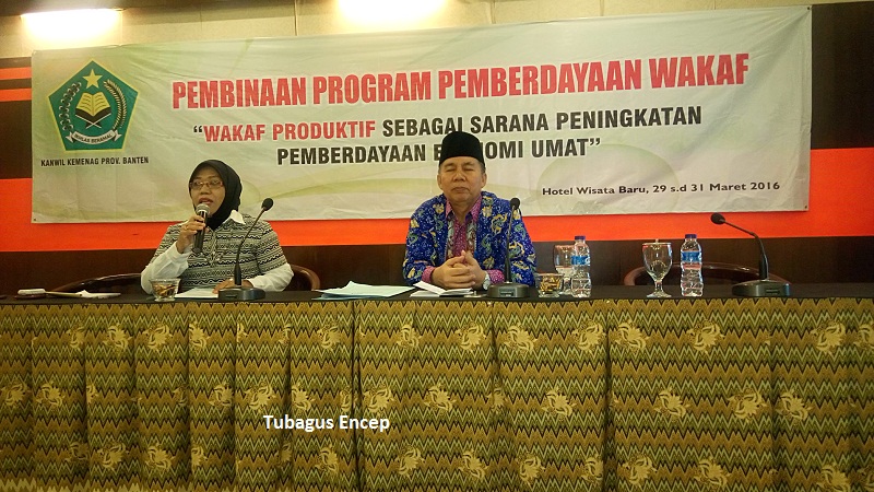 Acara pembinaan yang dibuka oleh Kepala Kanwil Kemenag Provinsi Banten Drs. H. Muhammad Agus Salim, MPd. pada hari Selasa, 29 Maret 2016 di Hotel Wisata Baru Serang dan akan berakhir pada 31 Maret 2016 hari ini mendatangkan beberapa nara sumber yang terdiri dari beberapa praktisi wakaf produktif dari Center Waqf Bani Umar, sebuah lembaga wakaf yang dimotori keluarga besar mantan wakil presiden Umar Wirahadikusuma dan praktisi wakaf dari BWI sendiri termasuk direktur BWI sendiri bapak DR. H. Suardi Abbas, SH, MH.