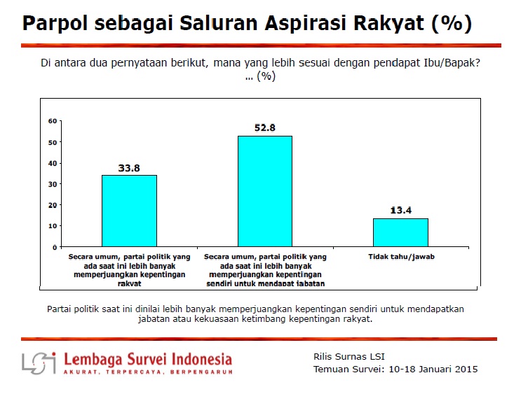 Sejalan dengan survey diatas, Survey LSI yang dirilis bulan Januari 2015 mengenai persepsi publik terhadap kinerja partai politik menjadi peluang bagi DPD RI untuk mendapatkan tempat di hati publik. Salah satu temuan survey ini adalah adanya adanya skeptisme masyarakat terhadap kiprah partai politik selama ini. Partai politik dinilai lebih banyak memperjuangkan kepentingan sendiri untuk mendapat kekuasaan ketimbang memperjuangkan kepentingan rakyat.