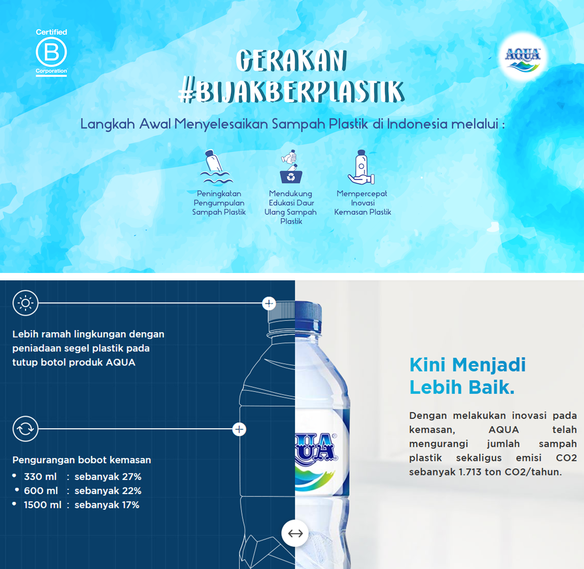 Perubahan baik yang dilakukan Aqua dalam komitenya terhadap pembangunan berkelanjutan ditunjukkan dengan kampanye gerakan #BijakBerplastik. Kampanye ini sendiri diawali dengan komitmen Aqua mengurangi penggunaan material plastik dalam kemasan botol dan galon Aqua seperti peniadaan segel plastik di bagian penutup botol, pengurangan bobot kemasan lebih dari 20% untuk setiap kategori, giat melakukan kampanye daur ulang di kota-kota besar di Indonesia, hingga komitmen membuat kemasan yang dapat didaur ulang 100% dalam upaya meningkatkan proporsi plastik plastik daur ulang sebanyak 50% pada 2025.